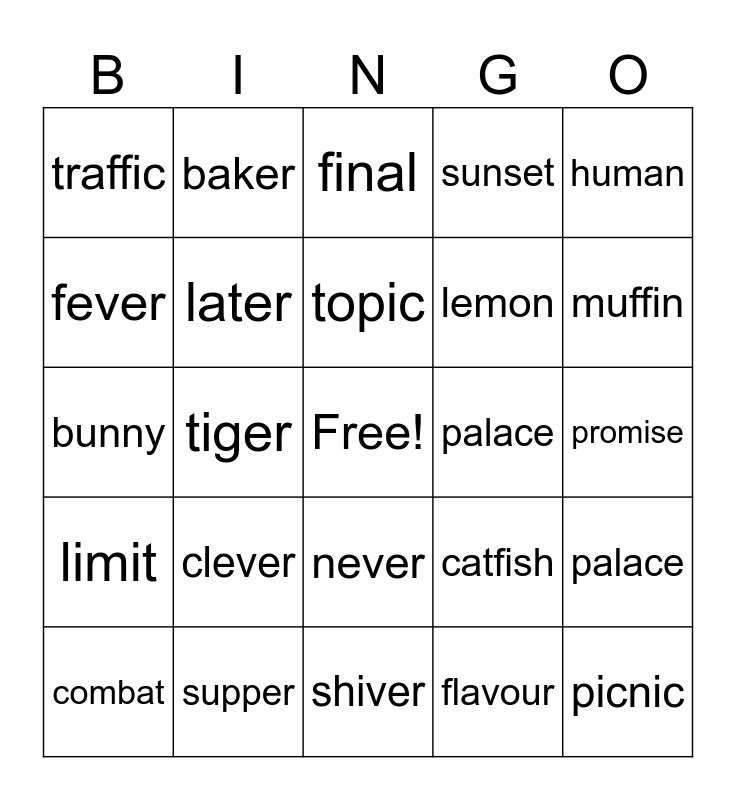 This bingo card has a free space and 24 words: clever, supper, topic, combat, human, traffic, fever, baker, palace, never, lemon, bunny, catfish, palace, later, flavour, promise, final, muffin, tiger, picnic, limit, sunset and shiver.