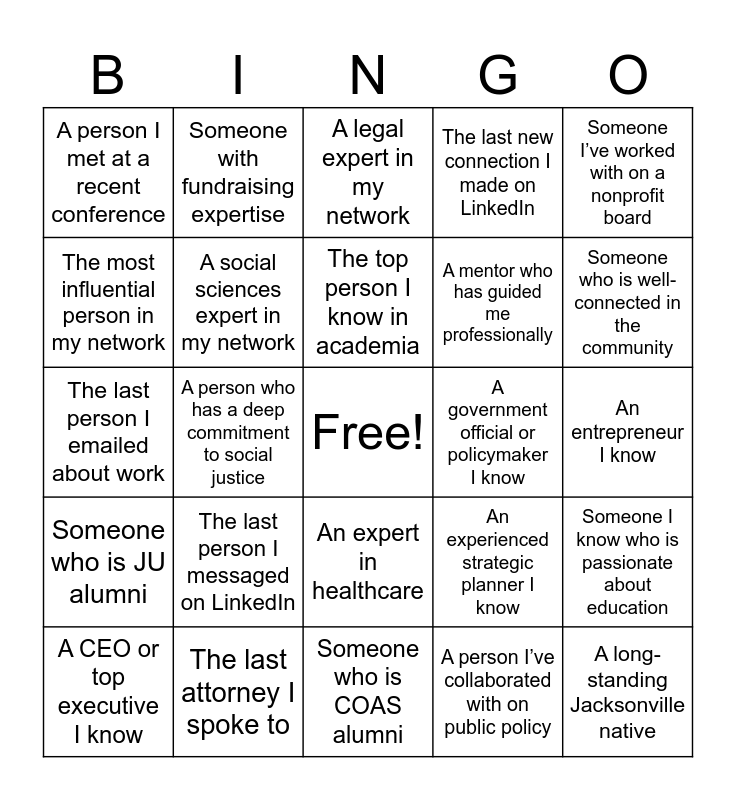 This bingo card has a free space and 24 words: The last person I messaged on LinkedIn, The last attorney I spoke to, The top person I know in academia, A CEO or top executive I know, Someone I’ve worked with on a nonprofit board, A person I met at a recent conference, The most influential person in my network, Someone with fundraising expertise, A government official or policymaker I know, An expert in healthcare, A mentor who has guided me professionally, The last person I emailed about work, An experienced strategic planner I know, Someone I know who is passionate about education, A social sciences expert in my network, A person I’ve collaborated with on public policy, An entrepreneur I know, A legal expert in my network, Someone who is well-connected in the community, A person who has a deep commitment to social justice, A long-standing Jacksonville native, Someone who is JU alumni, The last new connection I made on LinkedIn and Someone who is COAS alumni.