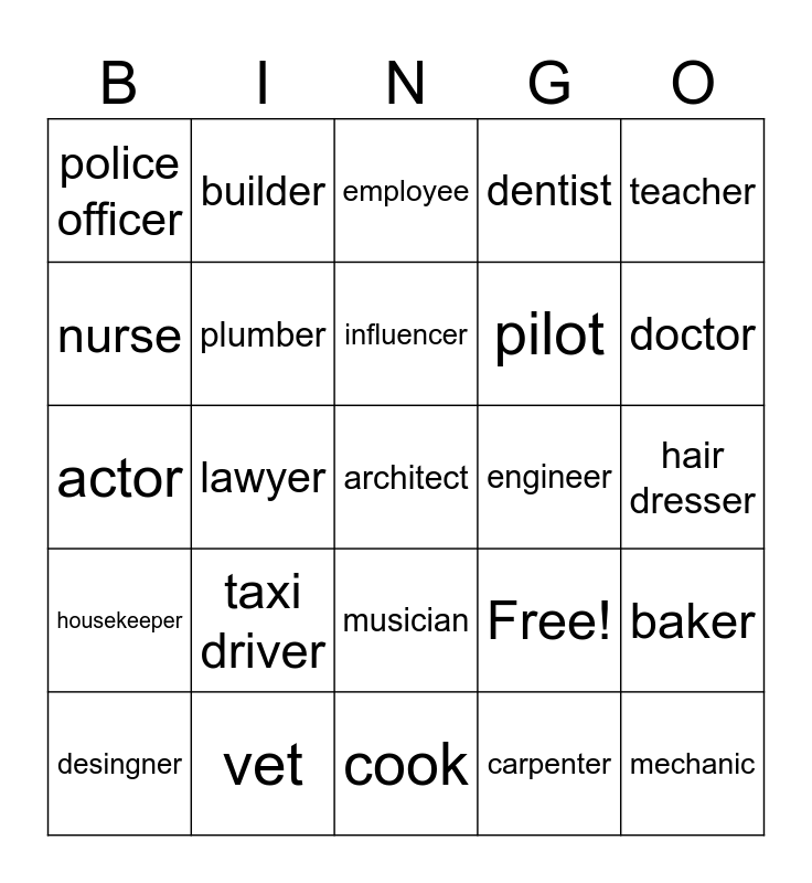 This bingo card has 25 words: taxi driver, cook, influencer, desingner, teacher, police officer, nurse, builder, engineer, musician, pilot, actor, Free!, baker, plumber, mechanic, hair dresser, employee, doctor, lawyer, architect, vet, housekeeper, dentist and carpenter.