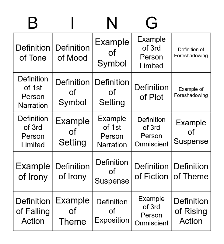 This bingo card has 25 words: Definition of Irony, Definition of Exposition, Definition of Setting, Definition of Falling Action, Definition of Foreshadowing, Definition of Tone, Definition of 1st Person Narration, Definition of Mood, Definition of 3rd Person Omniscient, Definition of Suspense, Definition of Plot, Definition of 3rd Person Limited, Definition of Fiction, Definition of Theme, Definition of Symbol, Definition of Rising Action, Example of Suspense, Example of Symbol, Example of Foreshadowing, Example of Setting, Example of 1st Person Narration, Example of Theme, Example of Irony, Example of 3rd Person Limited and Example of 3rd Person Omniscient.