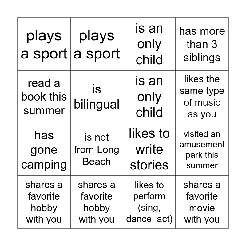 ⚠ This card has duplicate items: likes the same type of music as you (3), shares a favorite hobby with you (3), has more than 2 pets (3), read a book this summer (3), visited an amusement park this summer (3), likes to perform (sing, dance, act) (3), plays a sport (3), has gone camping (3), is bilingual (3), is not from Long Beach (3), is an only child (3), has more than 3 siblings (3), likes to write stories (3), shares a favorite movie with you (3), plays an instrument (3), has traveled outside of California (3)