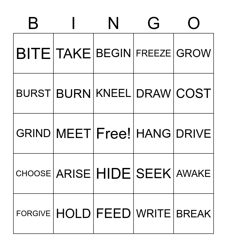 This bingo card has a free space and 24 words: FORGIVE, ARISE, KNEEL, WRITE, GROW, BITE, TAKE, BEGIN, HANG, DRIVE, GRIND, BURN, SEEK, AWAKE, BURST, HOLD, FEED, FREEZE, COST, CHOOSE, MEET, HIDE, DRAW and BREAK.