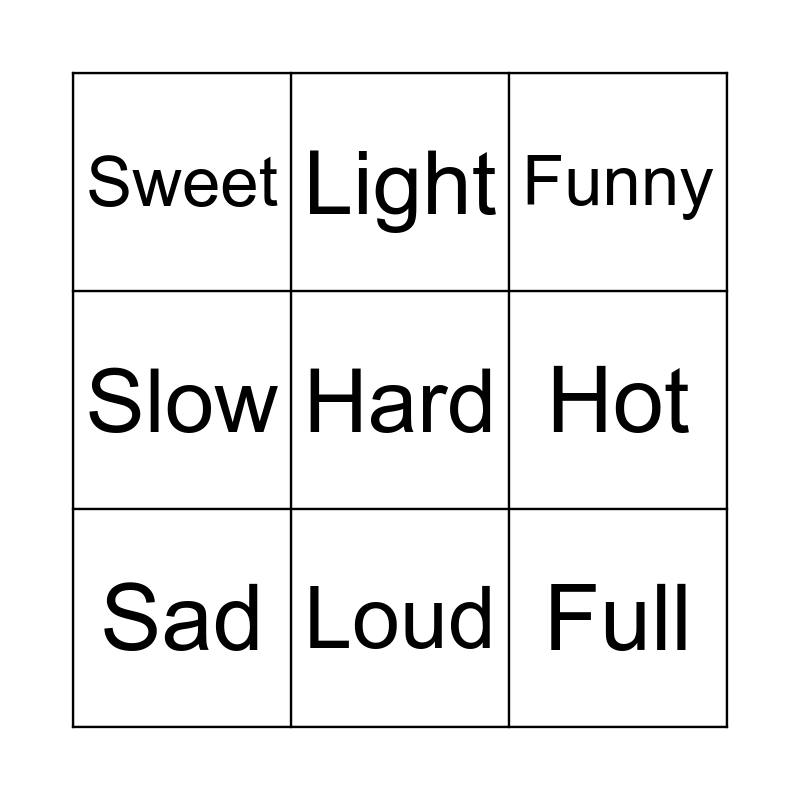 This bingo card has 35 words: Big, Small, Happy, Sad, Fast, Slow, Hot, Cold, Loud, Quiet, Soft, Hard, Bright, Dark, Sweet, Sour, Clean, Dirty, Strong, Weak, Tall, Short, Old, New, Funny, Boring, Round, Square, Full, Empty, Good, Bad, Heavy, Light and Warm.