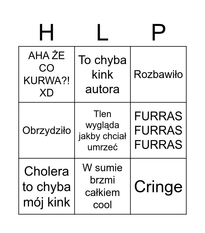 This bingo card has a free space and 8 words: FURRAS FURRAS FURRAS, Rozbawiło, To chyba kink autora, Cholera to chyba mój kink, AHA ŻE CO KURWA?! XD, Cringe, Obrzydziło and W sumie brzmi całkiem cool.