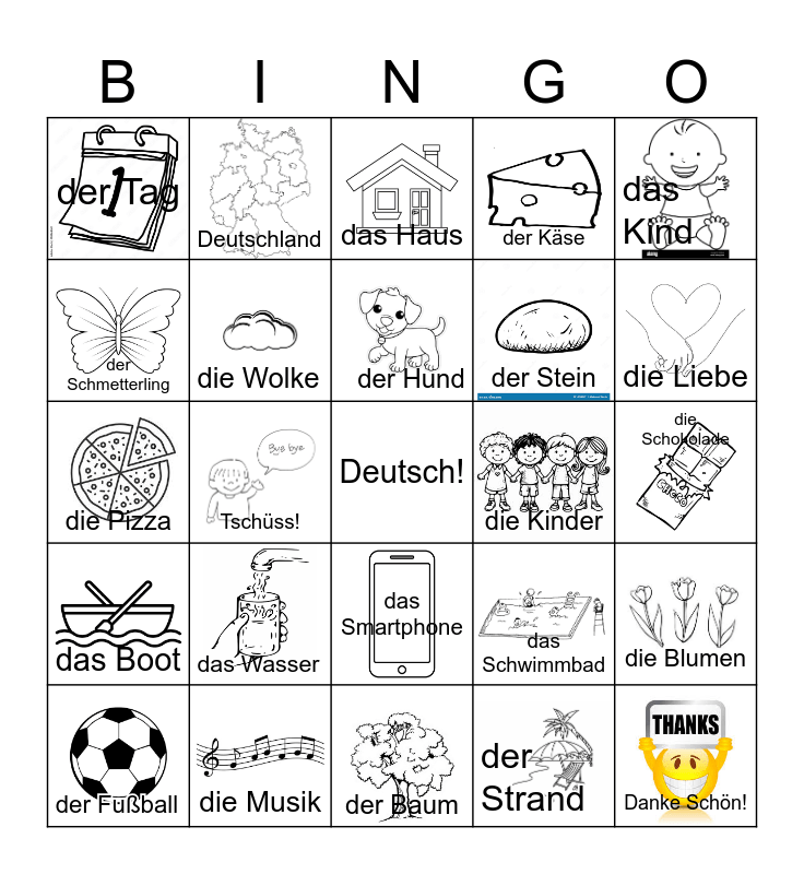 This bingo card has 34 images, a free space and 34 words: das Pferd, der Strand, der Vogel, das Buch, das Boot, die Wolke, das Kind, der Fußball, Deutschland, die Hand, der Hund, das Haus, die Katze, der Fuß, die Kinder, die Liebe, die Musik, die Pizza, das Wasser, das Schwimmbad, das Smartphone, das Hotel, der Tag, die Schokolade, der Baum, Danke Schön!, der Käse, die Schule, der Stein, der Schmetterling, der Apfel, Tschüss!, die Blumen and der König.