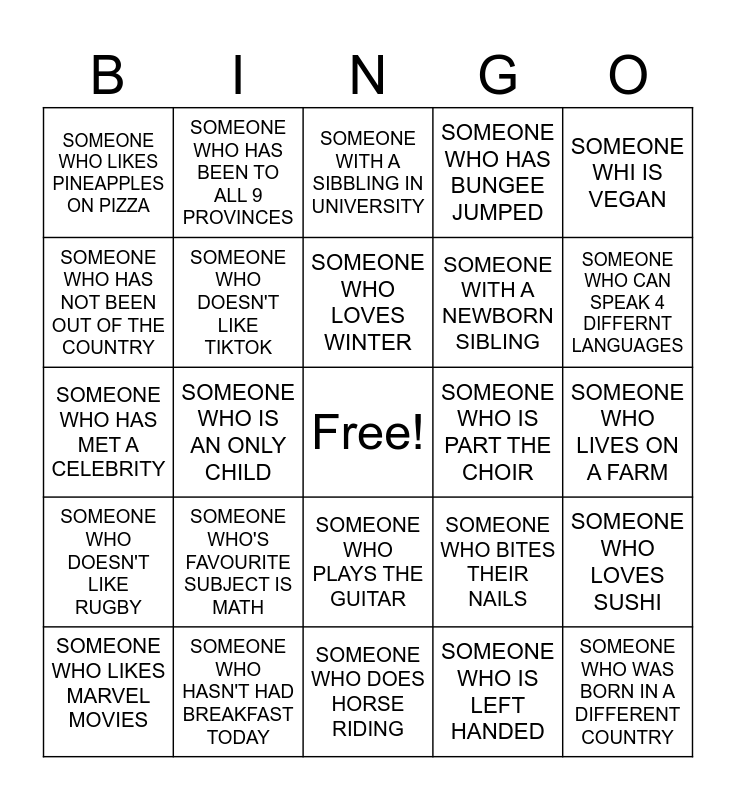 This bingo card has a free space and 29 words: SOMEONE WHO LIKES MARVEL MOVIES, SOMEONE WHO LIKES WAKING UP EARLY, SOMEONE WHO IS AN ONLY CHILD, SOMEONE YOU SHARE A BIRTHDAY MONTH WITH, SOMEONE WHO LIKES PINEAPPLES ON PIZZA, SOMEONE WITH A SIBBLING IN UNIVERSITY, SOMEONE WHO DOESN'T LIKE TIKTOK, SOMEONE WHO'S FAVOURITE SUBJECT IS MATH, SOMEONE WHO IS PART THE CHOIR, SOMEONE WHO HASN'T HAD BREAKFAST TODAY, SOMEONE WHO LIVES ON A FARM, SOMEONE WHO WAS BORN IN A DIFFERENT COUNTRY, SOMEONE WHO DOES HORSE RIDING, SOMEONE WHO IS LEFT HANDED, SOMEONE WHO CAN SPEAK 4 DIFFERNT LANGUAGES, SOMEONE WITH AN AFRO, SOMEONE WHO PLAYS THE GUITAR, SOMEONE WHO DOESN'T LIKE RUGBY, SOMEONE WHI IS VEGAN, SOMEONE WHO HAS MET A CELEBRITY, SOMEONE WHO BITES THEIR NAILS, FIND SOMEONE PLAYS HOCKEY, SOMEONE WITH A NEWBORN SIBLING, SOMEONE WHO HAS NOT BEEN OUT OF THE COUNTRY, SOMEONE WHO HAS BUNGEE JUMPED, SOMEONE WHO HAS BEEN TO ALL 9 PROVINCES, SOMEONE WHO LOVES SUSHI, SOMEONE WHO LOVES WINTER and SOMEONE WHO WRITES POETRY.