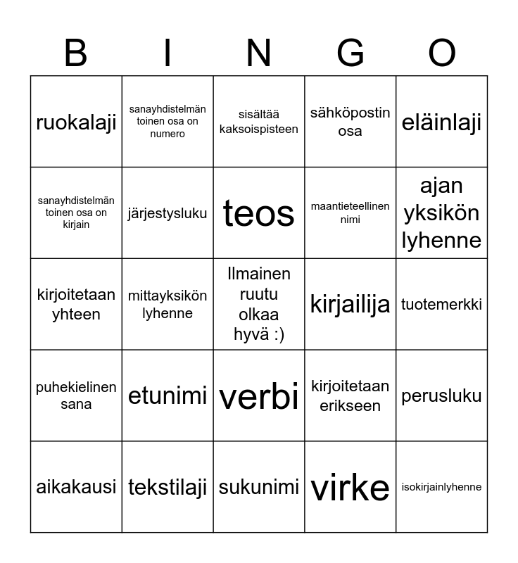 This bingo card has a free space and 25 words: etunimi, sukunimi, teos, aikakausi, eläinlaji, ruokalaji, sanayhdistelmän toinen osa on kirjain, sanayhdistelmän toinen osa on numero, kirjailija, verbi, maantieteellinen nimi, kirjoitetaan yhteen, kirjoitetaan erikseen, perusluku, järjestysluku, asiakirjan osa, tuotemerkki, sisältää kaksoispisteen, ajan yksikön lyhenne, mittayksikön lyhenne, isokirjainlyhenne, tekstilaji, puhekielinen sana, sähköpostin osa and virke.