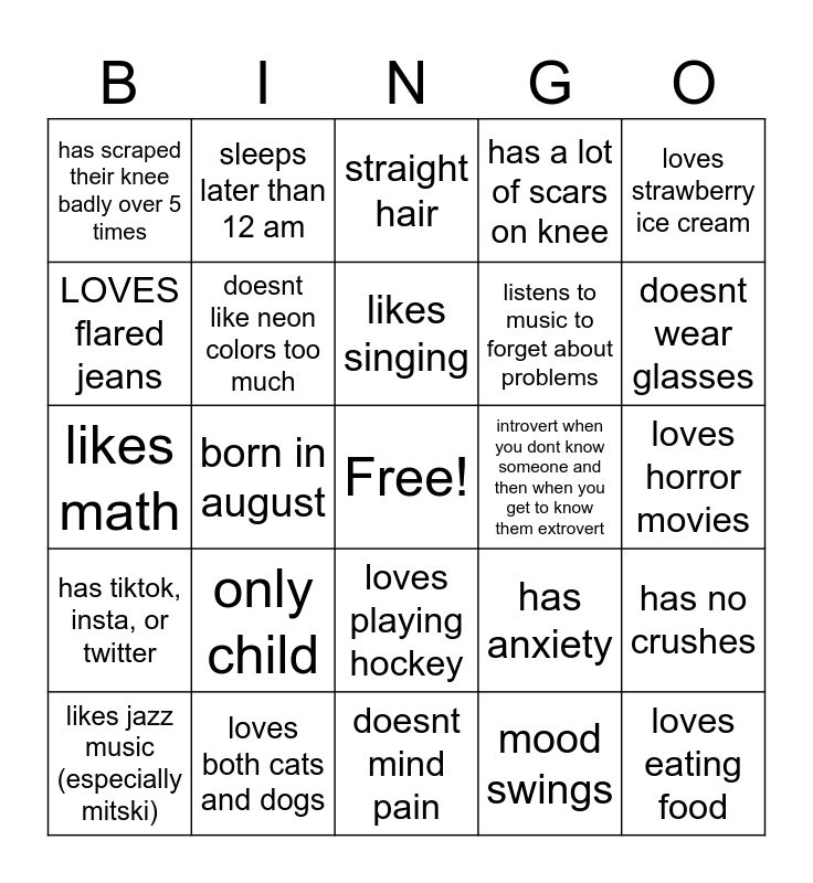 This bingo card has a free space and 24 words: only child, loves both cats and dogs, likes singing, likes jazz music (especially mitski), loves strawberry ice cream, has scraped their knee badly over 5 times, LOVES flared jeans, sleeps later than 12 am, introvert when you dont know someone and then when you get to know them extrovert, loves playing hockey, listens to music to forget about problems, likes math, has anxiety, has no crushes, doesnt like neon colors too much, mood swings, loves horror movies, straight hair, doesnt wear glasses, born in august, loves eating food, has tiktok, insta, or twitter, has a lot of scars on knee and doesnt mind pain.