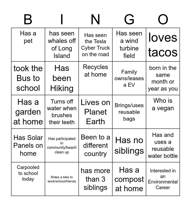 This bingo card has a free space and 24 words: Has participated in community/beach clean up, Rides a bike to work/school/friends, Recycles at home, Carpooled to school today, loves tacos, Has a pet, took the Bus to school, has seen whales off of Long Island, Brings/uses reusable bags, Been to a different country, Family owns/leases a EV, Has a garden at home, Has no siblings, Has and uses a reusable water bottle, Has been Hiking, Has a compost at home, Who is a vegan, Has seen the Tesla Cyber Truck on the road, born in the same month or year as you, Turns off water when brushes their teeth, Interested in an Environmental Career, Has Solar Panels on home, Has seen a wind turbine field and has more than 3 siblings.