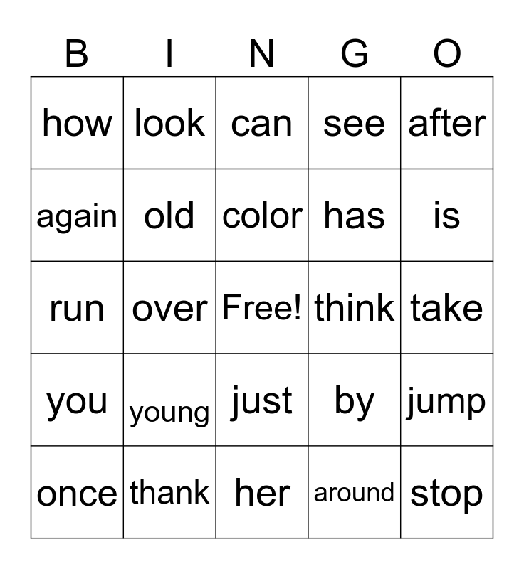 This bingo card has a free space and 24 words: young, thank, color, once, after, how, again, look, think, just, has, run, by, jump, old, around, take, can, is, over, stop, you, see and her.