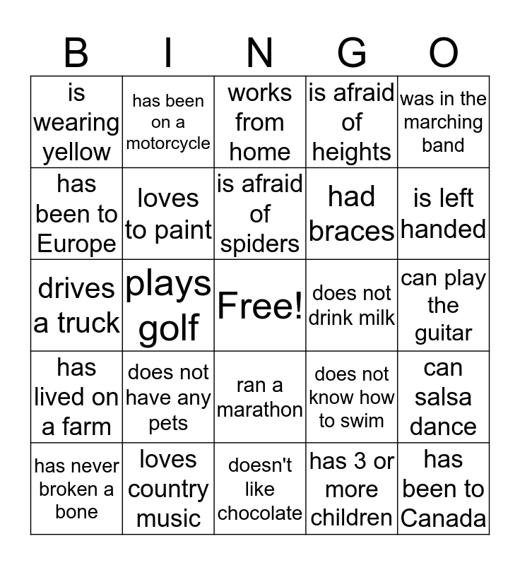 This bingo card has a free space and 24 words: does not have any pets, loves country music, is afraid of spiders, has never broken a bone, was in the marching band, is wearing yellow, has been to Europe, has been on a motorcycle, does not drink milk, ran a marathon, had braces, drives a truck, does not know how to swim, can salsa dance, loves to paint, has 3 or more children, can play the guitar, works from home, is left handed, plays golf, has been to Canada, has lived on a farm, is afraid of heights and doesn't like chocolate.