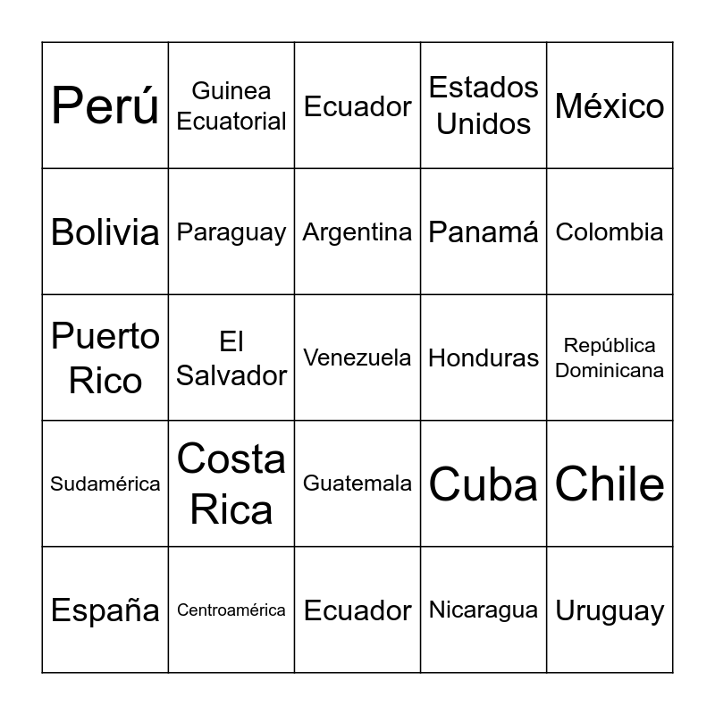 This bingo card has 25 words: Costa Rica, Ecuador, Argentina, España, México, Perú, Bolivia, Guinea Ecuatorial, Honduras, Guatemala, Panamá, Puerto Rico, Cuba, Chile, Paraguay, Uruguay, República Dominicana, Ecuador, Colombia, El Salvador, Venezuela, Centroamérica, Sudamérica, Estados Unidos and Nicaragua.