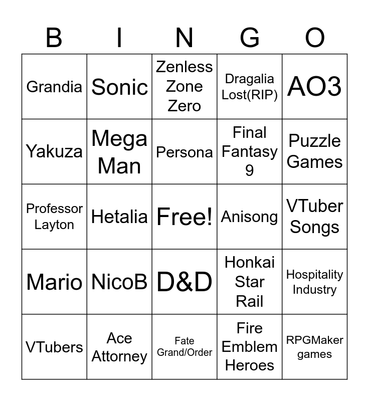 This bingo card has a free space and 24 words: NicoB, Ace Attorney, Persona, VTubers, AO3, Grandia, Yakuza, Sonic, Anisong, D&D, Final Fantasy 9, Professor Layton, Honkai Star Rail, Hospitality Industry, Mega Man, Fire Emblem Heroes, VTuber Songs, Zenless Zone Zero, Puzzle Games, Hetalia, RPGMaker games, Mario, Dragalia Lost(RIP) and Fate Grand/Order.