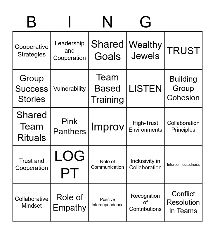 This bingo card has 38 words: Free!, Navy Seals, "Pick Up Basketball", Vulnerability, Interconnectedness, LOG PT, Team Based Training, The Upright Citizens Brigade, TRUST, LISTEN, Pink Panthers, Wealthy Jewels, Improv, Collaboration Principles, Group Success Stories, Trust and Cooperation, Effective Teamwork, Shared Goals, Mutual Support, High-Trust Environments, Cooperative Strategies, Role of Empathy, Building Group Cohesion, Collaborative Mindset, Coaching for Cooperation, Positive Interdependence, Conflict Resolution in Teams, Celebrating Team Achievements, Feedback and Growth, Team Bonding Activities, Encouraging Participation, Role of Communication, Recognition of Contributions, Leadership and Cooperation, Adaptive Problem-Solving, Inclusivity in Collaboration, Shared Team Rituals and Success through Cooperation.