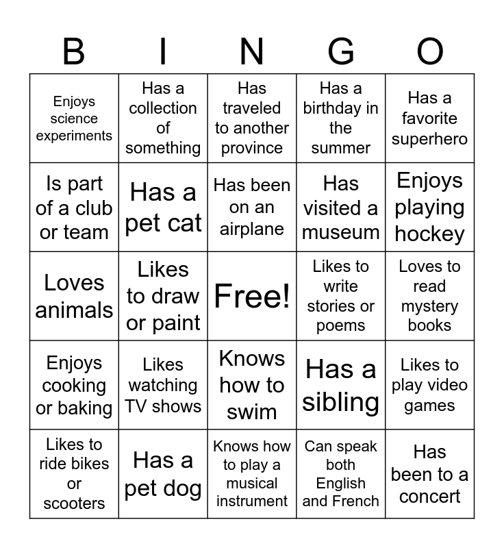 This bingo card has a free space and 24 words: Likes watching TV shows, Has a pet dog, Has been on an airplane, Likes to ride bikes or scooters, Has a favorite superhero, Enjoys science experiments, Is part of a club or team, Has a collection of something, Likes to write stories or poems, Knows how to swim, Has visited a museum, Loves animals, Has a sibling, Likes to play video games, Has a pet cat, Can speak both English and French, Loves to read mystery books, Has traveled to another province, Enjoys playing hockey, Likes to draw or paint, Has been to a concert, Enjoys cooking or baking, Has a birthday in the summer and Knows how to play a musical instrument.