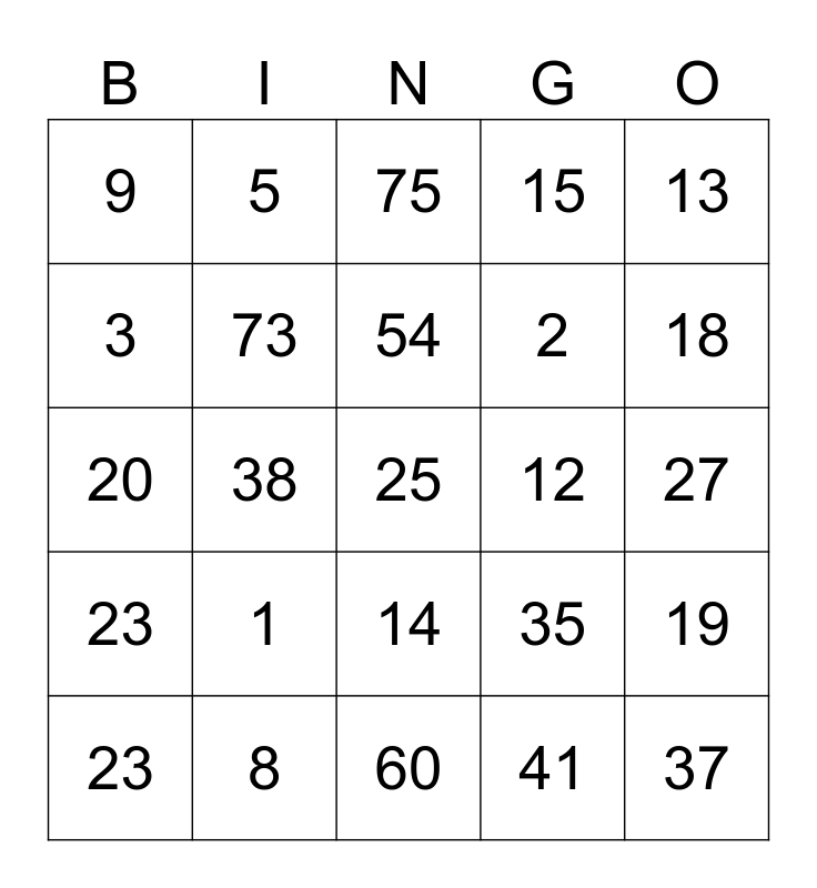 This bingo card has a free space and 24 words: 1, 8, 54, 23, 13, 9, 3, 5, 12, 14, 2, 20, 35, 19, 73, 41, 27, 75, 18, 38, 37, 23, 15 and 60.