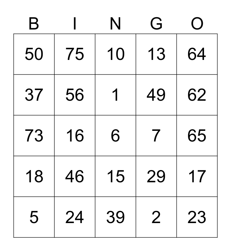 This bingo card has a free space and 24 words: 46, 24, 1, 5, 64, 50, 37, 75, 7, 15, 49, 73, 29, 17, 56, 2, 65, 10, 62, 16, 23, 18, 13 and 39.