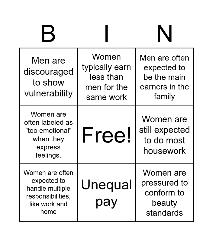 This bingo card has a free space and 9 words: Women are often expected to handle multiple responsibilities, like work and home, Men are often expected to be the main earners in the family, Women typically earn less than men for the same work, Women are often labeled as "too emotional" when they express feelings., Men are discouraged to show vulnerability, Women are still expected to do most housework, Women are pressured to conform to beauty standards, Women without children often face judgment or are seen as selfish and Unequal pay.