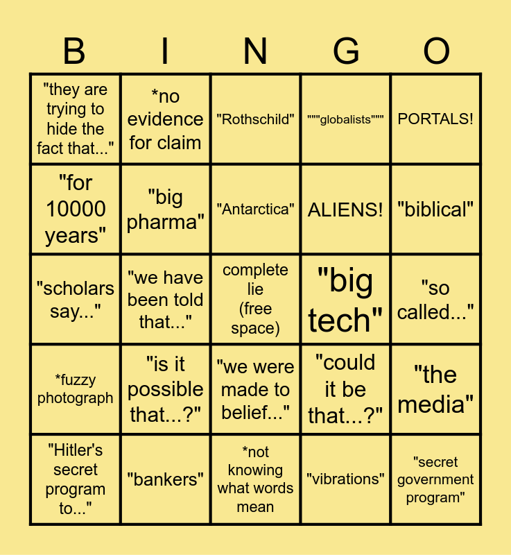 This bingo card has a free space and 24 words: "is it possible that...?", "bankers", "Antarctica", "Hitler's secret program to...", PORTALS!, "they are trying to hide the fact that...", "for 10000 years", *no evidence for claim, "big tech", "we were made to belief...", ALIENS!, "scholars say...", "could it be that...?", "the media", "big pharma", "vibrations", "so called...", "Rothschild", "biblical", "we have been told that...", "secret government program", *fuzzy photograph, """globalists""" and *not knowing what words mean.