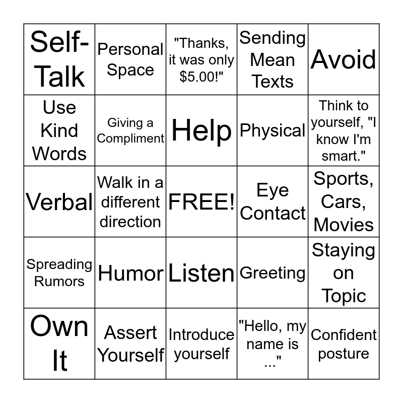 This bingo card has a free space and 24 words: Humor, Assert Yourself, Help, Own It, Avoid, Self-Talk, Use Kind Words, Personal Space, Eye Contact, Listen, Physical, Verbal, Greeting, Staying on Topic, Giving a Compliment, "Hello, my name is ...", Sports, Cars, Movies, "Thanks, it was only $5.00!", Think to yourself, "I know I'm smart.", Walk in a different direction, Confident posture, Spreading Rumors, Sending Mean Texts and Introduce yourself.