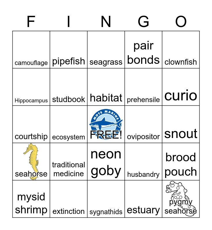 This bingo card has 3 images, a free space and 27 words: husbandry, aquaculture, prehensile, sygnathids, Hippocampus, seagrass, pipefish, seahorse, ovipositor, brood pouch, courtship, pair bonds, mysid shrimp, extinction, curio, AZA, studbook, habitat, traditional medicine, camouflage, snout, estuary, ecosystem, pygmy seahorse, neon goby, clownfish and snook.