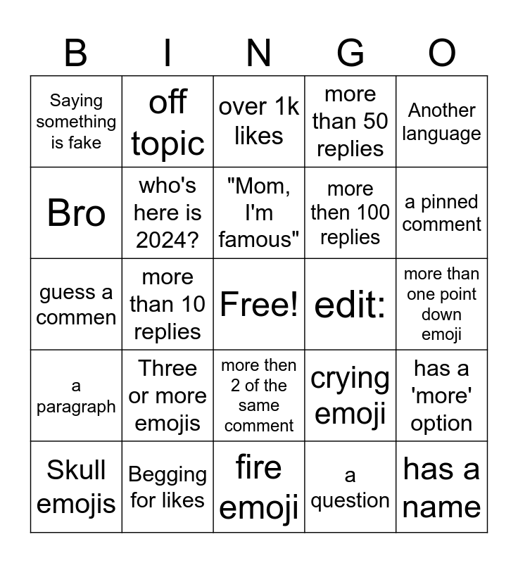This bingo card has a free space and 24 words: Three or more emojis, Begging for likes, "Mom, I'm famous", Skull emojis, Another language, Saying something is fake, Bro, off topic, edit:, more then 2 of the same comment, more then 100 replies, guess a commen, crying emoji, has a 'more' option, who's here is 2024?, a question, more than one point down emoji, over 1k likes, a pinned comment, more than 10 replies, has a name, a paragraph, more than 50 replies and fire emoji.