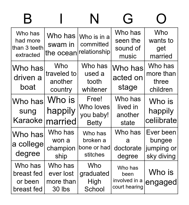 This bingo card has a free space and 24 words: Who has won a champion ship, Who has ever lost more than 30 lbs, Who has used a tooth whitener, Who has breast fed or been breast fed, Who wants to get married, Who has had more than 3 teeth extracted, Who has driven a boat, Who has swam in the ocean, Who has lived in another state, Who has broken a bone or had stitches, Who has acted on stage, Who has sung Karaoke, Who has a doctorate degree, Ever been bungee jumping or sky diving, Who traveled to another country, Who has been involved in a court hearing, Who is happily celiibrate, Who is in a committed relationship, Who has more than three children, Who is happily married, Who is engaged, Who has a college degree, Who has seen the sound of music and Who graduated High School.