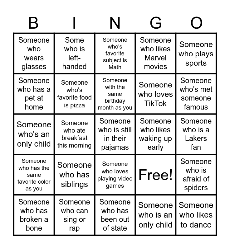 This bingo card has 25 words: Someone who has siblings, Someone who has been out of state, Someone with the same birthday month as you, Someone who has broken a bone, Someone who plays sports, Someone who wears glasses, Someone who has a pet at home, Some who is left-handed, Someone who likes waking up early, Someone who loves playing video games, Someone who loves TikTok, Someone who's an only child, Free!, Someone who is afraid of spiders, Someone who's favorite food is pizza, Someone who likes to dance, Someone who is a Lakers fan, Someone who's favorite subject is Math, Someone who's met someone famous, Someone who ate breakfast this morning, Someone who is still in their pajamas, Someone who can sing or rap, Someone who has the same favorite color as you, Someone who likes Marvel movies and Someone who is an only child.