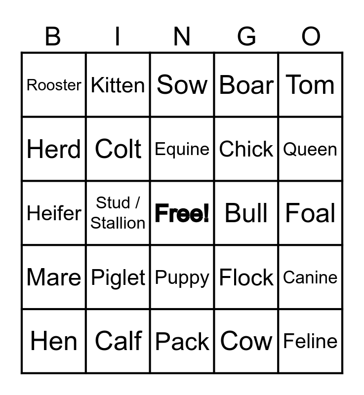 This bingo card has a free space and 26 words: Puppy, Cow, Equine, Calf, Tom, Rooster, Herd, Kitten, Foal, Flock, Chick, Heifer, Canine, Hen, Stud / Stallion, Filly, Boar, Mare, Sow, Feline, Queen, Pack, Bull, Piglet, Colt and Female dog.
