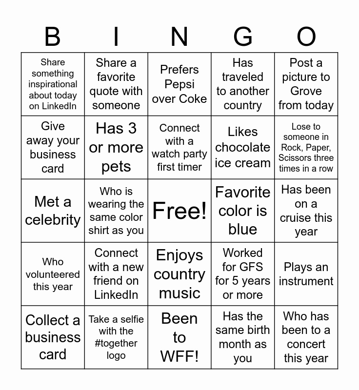 This bingo card has a free space and 24 words: Connect with a new friend on LinkedIn, Take a selfie with the #together logo, Connect with a watch party first timer, Collect a business card, Post a picture to Grove from today, Share something inspirational about today on LinkedIn, Give away your business card, Share a favorite quote with someone, Favorite color is blue, Enjoys country music, Likes chocolate ice cream, Met a celebrity, Worked for GFS for 5 years or more, Plays an instrument, Has 3 or more pets, Has the same birth month as you, Has been on a cruise this year, Prefers Pepsi over Coke, Lose to someone in Rock, Paper, Scissors three times in a row, Who is wearing the same color shirt as you, Who has been to a concert this year, Who volunteered this year, Has traveled to another country and Been to WFF!.