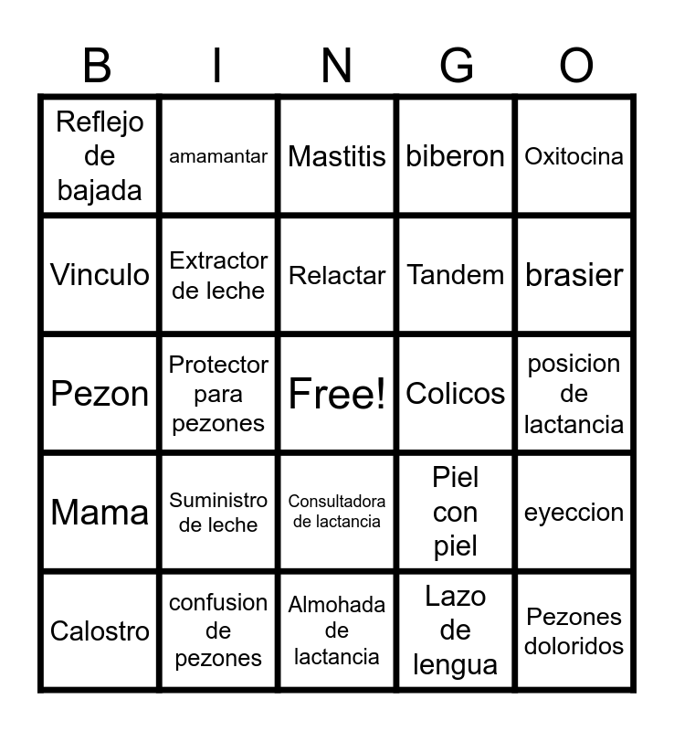 This bingo card has a free space and 29 words: Calostro, Congestion mamaria, Protector para pezones, Alimentacion, Reflejo de bajada, Mastitis, Extractor de leche, Suministro de leche, Colicos, confusion de pezones, posicion de lactancia, Pezones doloridos, Almohada de lactancia, Lazo de lengua, brasier, leche, Consultadora de lactancia, Mama, Oxitocina, Pezon, Piel con piel, Prolactina, Tandem, Vinculo, biberon, amamantar, eyeccion, Relactar and Ubicarse.