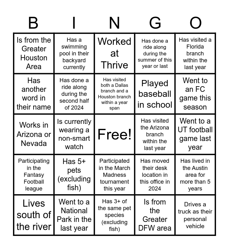 This bingo card has a free space and 47 words: Been to 5 National Parks, Drives a truck as their personal vehicle, Goes by another name other than their legal name, Has 3+ of the same pet species (excluding fish), Has 5+ pets (excluding fish), Has a J, Q, or Z in their name, Has a swimming pool in their backyard currently, Has an exotic pet, Has another word in their name, Has been with SPS for 2+ years, Has done a ride along during the second half of 2024, Has done a ride along during the summer of this year or last, Has lived in the Austin area for more than 5 years, Has moved their desk location in this office in 2024, Has only lived in Texas, Has visited all 4 Swim Pure locations in a year span, Has visited both a Dallas branch and a Houston branch within a year span, Has visited the Arizona branch within the last year, Has visited the Nevada branch within the last year, Has visited a Florida branch within the last year, Is currently wearing a non-smart watch, Is from the Greater DFW area, Is from the Greater Houston Area, Played baseball in school, Lived in California, Went to an FC game this season, Lives south of the river, Oldest person in their department by tenure, Participated in the March Madness tournament this year, Participating in the Fantasy Football league, Played baseball in school, Served in the Armed Forces, Speaks another language fluently, Was in a band, Wears corrective lens, Went to a National Park in the last year, Went to a UT football game last year, Went to an FC game this season, Went to college in Louisana, Went to college in Texas, Worked at our old office (Missouri Pacific), Worked at Thrive, Works in Arizona or Nevada, Works in Florida, Works in the Integration department, Works in the IT department and Works in the Operation Support department (per Accounting).