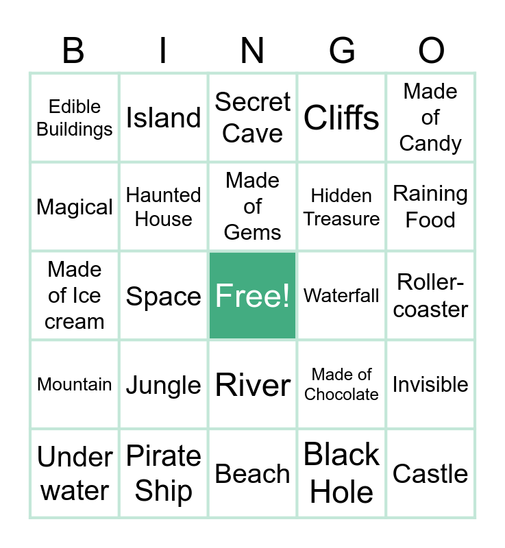 This bingo card has a free space and 29 words: Under water, Volcano, Space, City, Edible Buildings, Secret Cave, Haunted House, Jungle, Waterfall, Pirate Ship, Roller-coaster, Castle, Beach, Black Hole, Raining Food, Rainbow anything, River, Mountain, Made of Candy, Made of Ice cream, Made of Chocolate, Made of Pizza, Hidden Treasure, Magical, Cliffs, Island, Invisible, Made of Gems and Made of Gold.