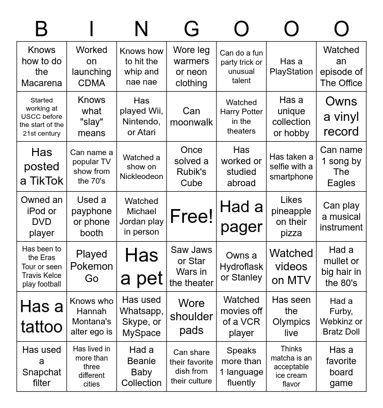 This bingo card has a free space and 48 words: Watched movies off of a VCR player, Has a unique collection or hobby, Can share their favorite dish from their culture, Used a payphone or phone booth, Watched a show on Nickleodeon, Can play a musical instrument, Worked on launching CDMA, Has lived in more than three different cities, Has a PlayStation, Saw Jaws or Star Wars in the theater, Watched an episode of The Office, Wore leg warmers or neon clothing, Has taken a selfie with a smartphone, Has worked or studied abroad, Has a tattoo, Likes pineapple on their pizza, Started working at USCC before the start of the 21st century, Owns a vinyl record, Has seen the Olympics live, Can do a fun party trick or unusual talent, Watched Harry Potter in the theaters, Watched Michael Jordan play in person, Knows how to do the Macarena, Knows what "slay" means, Had a Furby, Webkinz or Bratz Doll, Has played Wii, Nintendo, or Atari, Can name 1 song by The Eagles, Has used a Snapchat filter, Once solved a Rubik's Cube, Can name a popular TV show from the 70's, Thinks matcha is an acceptable ice cream flavor, Had a pager, Had a mullet or big hair in the 80's, Knows who Hannah Montana's alter ego is, Owned an iPod or DVD player, Owns a Hydroflask or Stanley, Watched videos on MTV, Has posted a TikTok, Has a pet, Has used Whatsapp, Skype, or MySpace, Has been to the Eras Tour or seen Travis Kelce play football, Has a favorite board game, Knows how to hit the whip and nae nae, Had a Beanie Baby Collection, Can moonwalk, Wore shoulder pads, Played Pokemon Go and Speaks more than 1 language fluently.