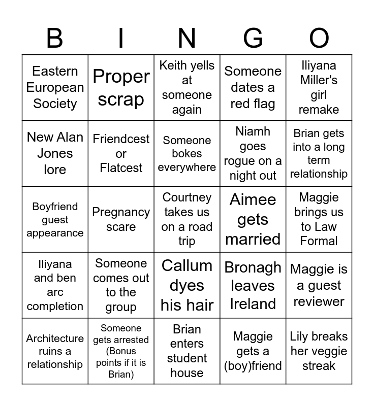 This bingo card has 25 words: Someone comes out to the group, Brian enters student house, Someone bokes everywhere, Architecture ruins a relationship, Iliyana Miller's girl remake, Eastern European Society, New Alan Jones lore, Proper scrap, Aimee gets married, Callum dyes his hair, Niamh goes rogue on a night out, Boyfriend guest appearance, Bronagh leaves Ireland, Maggie is a guest reviewer, Friendcest or Flatcest, Lily breaks her veggie streak, Maggie brings us to Law Formal, Keith yells at someone again, Brian gets into a long term relationship, Pregnancy scare, Courtney takes us on a road trip, Someone gets arrested (Bonus points if it is Brian), Iliyana and ben arc completion, Someone dates a red flag and Maggie gets a (boy)friend.