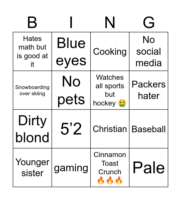 This bingo card has 16 words: gaming, Baseball, Cooking, Hates math but is good at it, Dirty blond, Blue eyes, Christian, Cinnamon Toast Crunch 🔥🔥🔥, Snowboarding over skiing, No pets, Younger sister, No social media, 5’2, Packers hater, Watches all sports but hockey 🤮 and Pale.