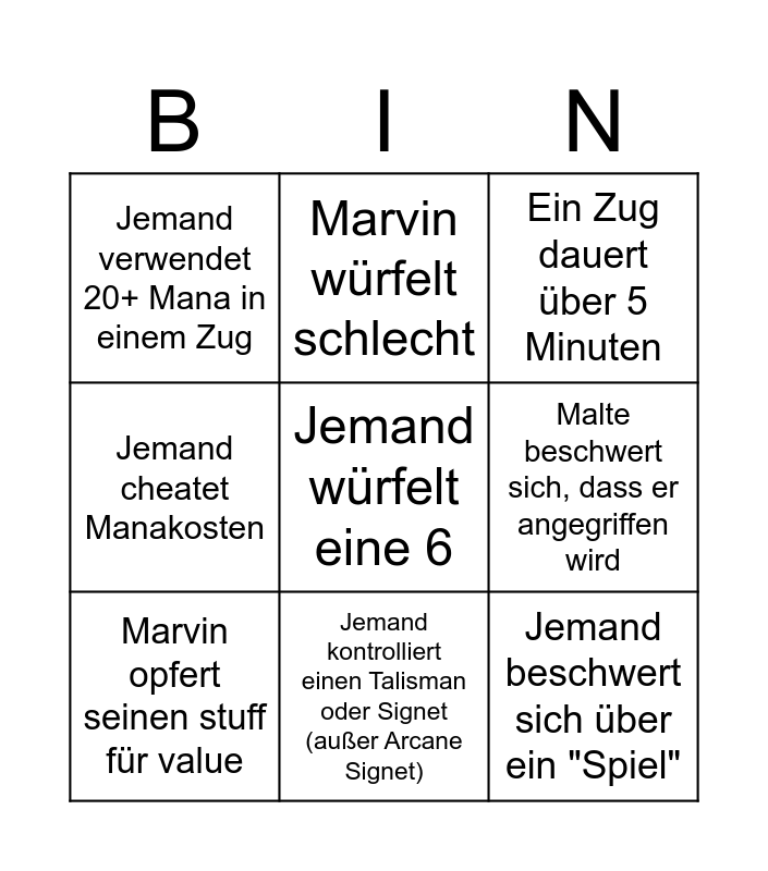 This bingo card has a free space and 8 words: Malte beschwert sich, dass er angegriffen wird, Ein Zug dauert über 5 Minuten, Marvin würfelt schlecht, Marvin opfert seinen stuff für value, Jemand verwendet 20+ Mana in einem Zug, Jemand beschwert sich über ein "Spiel", Jemand cheatet Manakosten and Jemand kontrolliert einen Talisman oder Signet (außer Arcane Signet).