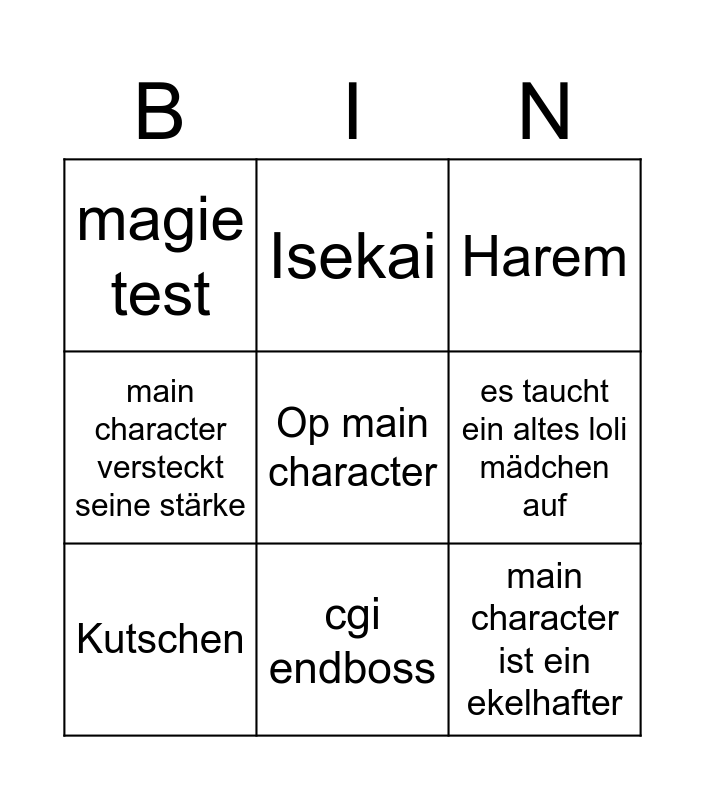 This bingo card has a free space and 8 words: es taucht ein altes loli mädchen auf, Harem, Isekai, Kutschen, magie test, main character ist ein ekelhafter, main character versteckt seine stärke and cgi endboss.