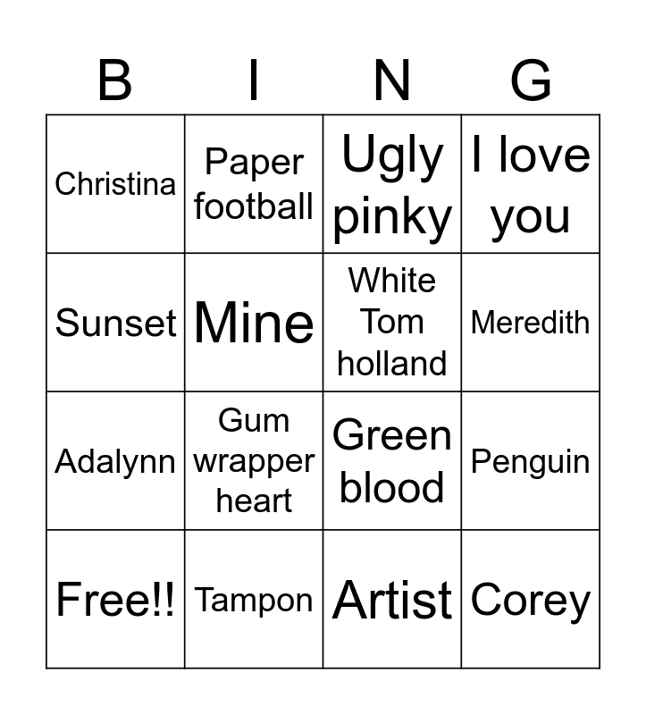 This bingo card has 16 words: Tampon, Penguin, Ugly pinky, Christina, Adalynn, Paper football, Green blood, Artist, Sunset, Mine, Free!!, I love you, Gum wrapper heart, Meredith, White Tom holland and Corey.