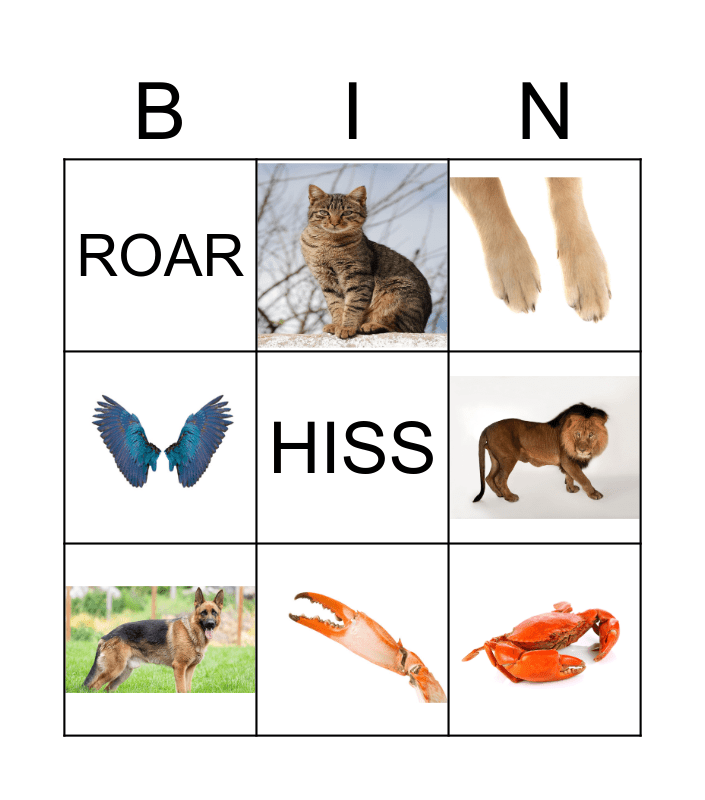 This bingo card has 9 images, a free space and 2 words: ROAR and MEOW.