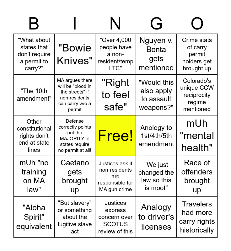 This bingo card has a free space and 24 words: Caetano gets brought up, "But slavery" or something about the fugitive slave act, "Right to feel safe", "Aloha Spirit" equivalent, Crime stats of carry permit holders get brought up, "What about states that don't require a permit to carry?", "The 10th amendment", "Bowie Knives", Anology to 1st/4th/5th amendment, Justices ask if non-residents are responsible for MA gun crime, "Would this also apply to assault weapons?", Other constitutional rights don’t end at state lines, "We just changed the law so this is moot", Race of offenders brought up, MA argues there will be "blood in the streets" if non-residents can carry w/o a permit, Analogy to driver's licenses, mUh "mental health", "Over 4,000 people have a non-resident/temp LTC", Colorado's unique CCW reciprocity regime mentioned, Defense correctly points out the MAJORITY of states require no permit at all!, Travelers had more carry rights historically, mUh "no training on MA law", Nguyen v. Bonta gets mentioned and Justices express concern over SCOTUS review of this.