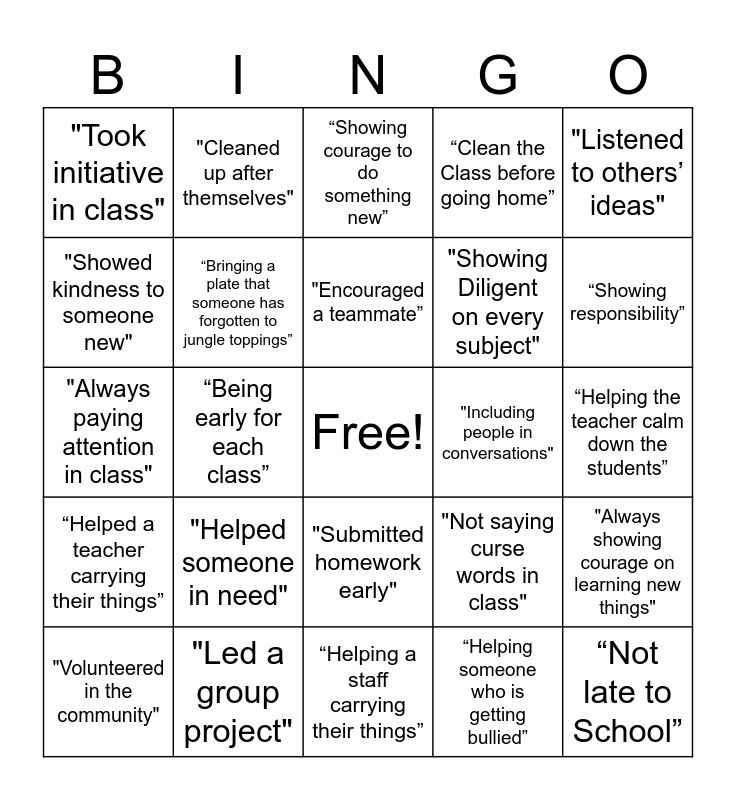 This bingo card has a free space and 24 words: "Helped someone in need", "Led a group project", "Encouraged a teammate”, "Volunteered in the community", "Listened to others’ ideas", "Took initiative in class", "Showed kindness to someone new", "Cleaned up after themselves", "Including people in conversations", "Submitted homework early", "Showing Diligent on every subject", "Always paying attention in class", "Not saying curse words in class", "Always showing courage on learning new things", “Bringing a plate that someone has forgotten to jungle toppings”, “Helping someone who is getting bullied”, “Helping the teacher calm down the students”, “Showing courage to do something new”, “Showing responsibility”, “Being early for each class”, “Not late to School”, “Helped a teacher carrying their things”, “Clean the Class before going home” and “Helping a staff carrying their things”.
