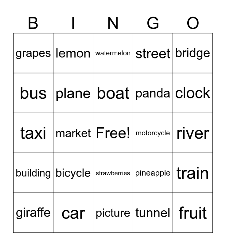 This bingo card has a free space and 24 words: bicycle, car, boat, giraffe, bridge, grapes, bus, lemon, motorcycle, strawberries, panda, taxi, pineapple, train, plane, tunnel, river, watermelon, clock, market, fruit, building, street and picture.