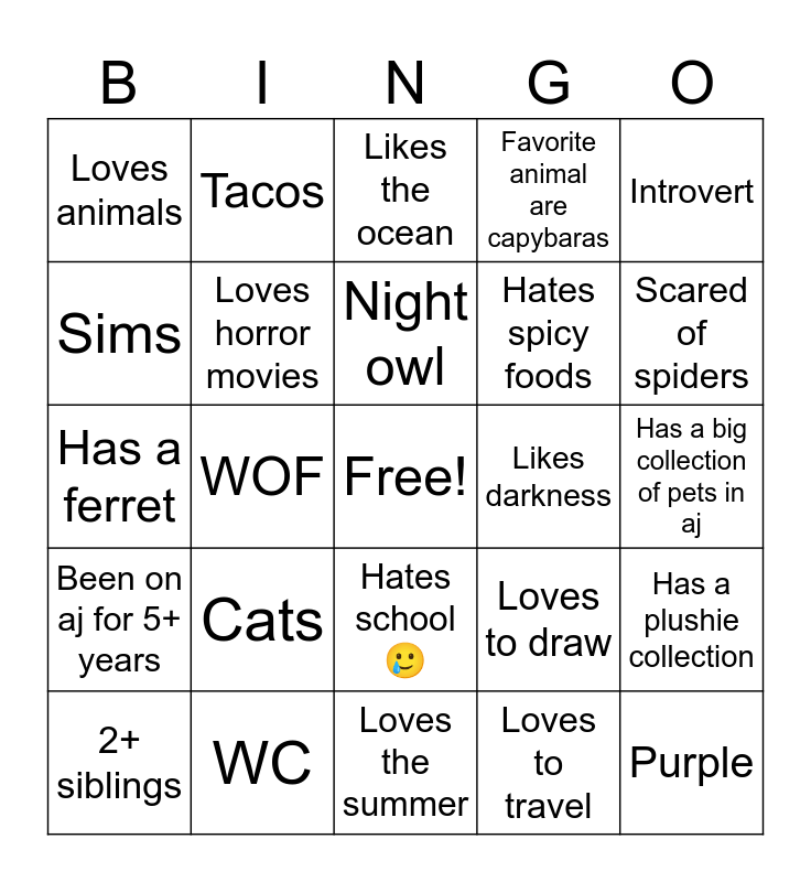 This bingo card has a free space and 24 words: Cats, WC, Night owl, 2+ siblings, Introvert, Loves animals, Sims, Tacos, Likes darkness, Hates school🥲, Hates spicy foods, Has a ferret, Loves to draw, Has a plushie collection, Loves horror movies, Loves to travel, Has a big collection of pets in aj, Likes the ocean, Scared of spiders, WOF, Purple, Been on aj for 5+ years, Favorite animal are capybaras and Loves the summer.