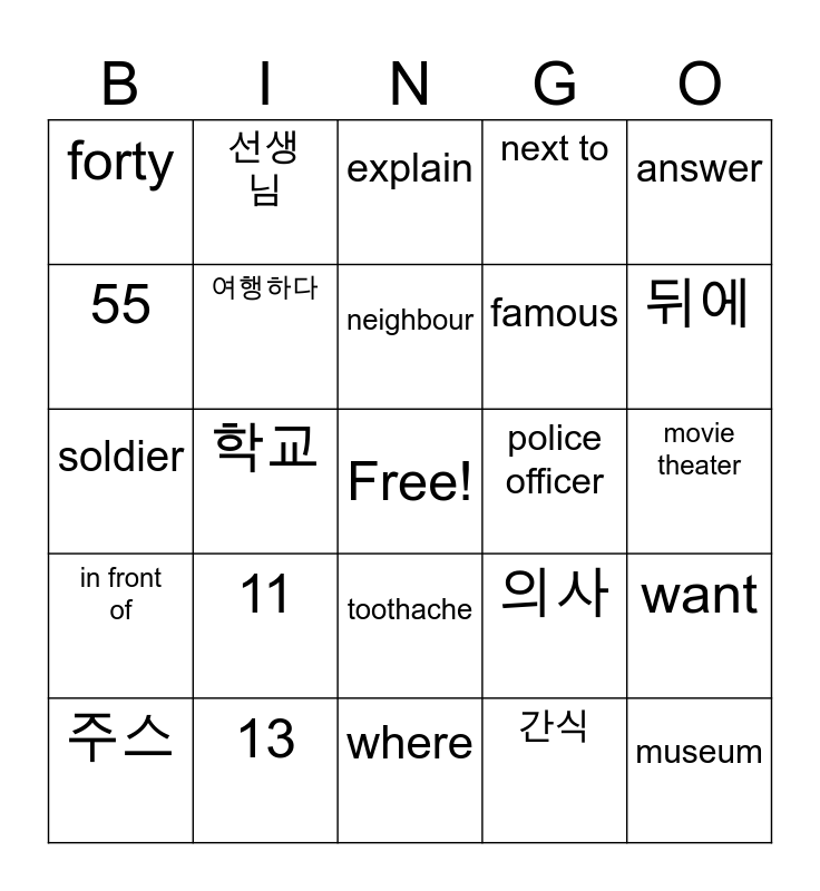 This bingo card has a free space and 24 words: 11, 13, neighbour, 주스, answer, forty, 55, 선생님, police officer, toothache, famous, soldier, 의사, want, 여행하다, 간식, movie theater, explain, 뒤에, 학교, museum, in front of, next to and where.