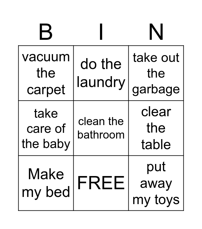 This bingo card has 9 words: Make my bed, take out the garbage, do the laundry, take care of the baby, vacuum the carpet, clear the table, clean the bathroom, put away my toys and FREE.