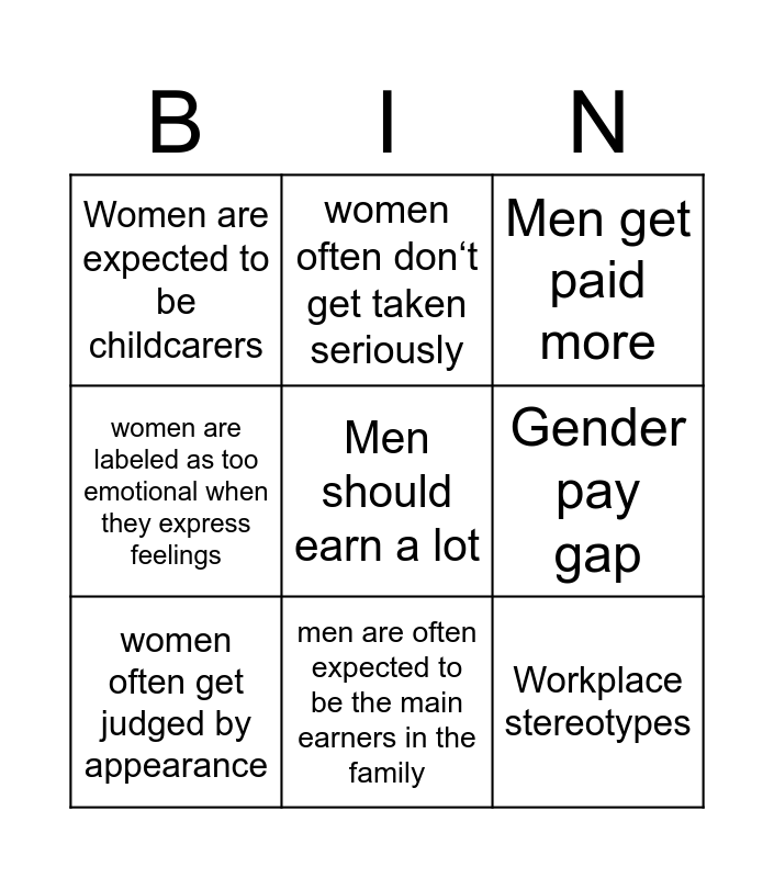 This bingo card has a free space and 8 words: Gender pay gap, Men get paid more, women often don‘t get taken seriously, women often get judged by appearance, Women are expected to be childcarers, Workplace stereotypes, women are labeled as too emotional when they express feelings and men are often expected to be the main earners in the family.