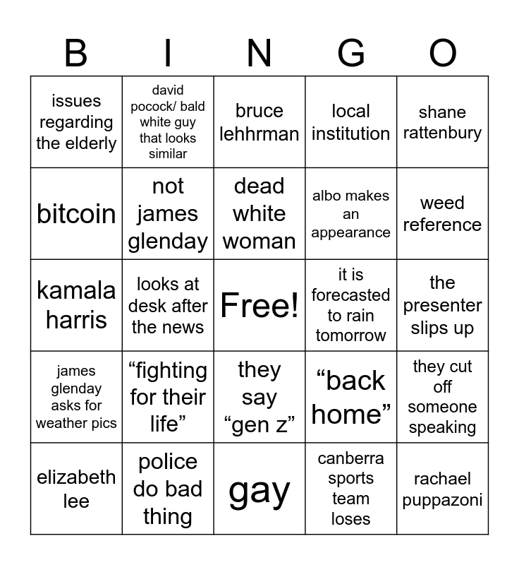 This bingo card has a free space and 47 words: disability + sport, rachael puppazoni, ukraine, gay, “fighting for their life”, james glenday says n degrees maybe even n+1, david pocock/ bald white guy that looks similar, israel-gaza, bitcoin, expressive statement during the weather, not james glenday, local institution, they cut off someone speaking, “back home”, trump, india reference, dead white woman, it is forecasted to rain tomorrow, china, shane rattenbury, looks at desk after the news, canberra sports team loses, issues regarding the elderly, albo makes an appearance, “mental health”, weed reference, elizabeth lee, the royals mentioned, they say “gen z”, james glenday asks for weather pics, hot weather, women’s sport before men’s, ANU mentioned, We see a place that we’ve been to, “cost of living crisis”, police do bad thing, the presenter slips up, a trigger warning, zoom interview, they try to warn you about an illness, alyson horn, bruce lehhrman, kamala harris, rhyming couplet, they say the n in government, andrew barr and white terrorists.