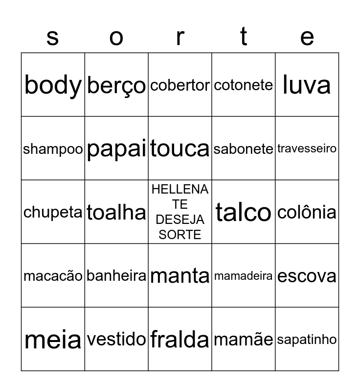 This bingo card has a free space and 24 words: banheira, vestido, touca, meia, luva, body, shampoo, berço, talco, manta, sabonete, chupeta, mamadeira, escova, papai, mamãe, colônia, cobertor, travesseiro, toalha, sapatinho, macacão, cotonete and fralda.