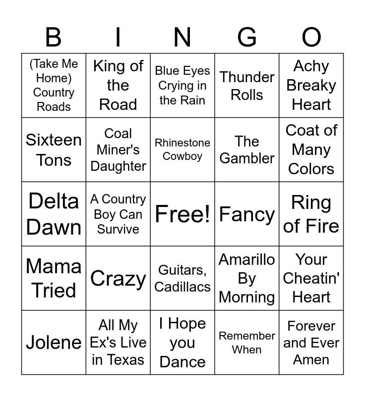 This bingo card has a free space and 24 words: Crazy, All My Ex's Live in Texas, Rhinestone Cowboy, Jolene, Achy Breaky Heart, (Take Me Home) Country Roads, Sixteen Tons, King of the Road, Fancy, Guitars, Cadillacs, The Gambler, Delta Dawn, Amarillo By Morning, Your Cheatin' Heart, Coal Miner's Daughter, Remember When, Ring of Fire, Blue Eyes Crying in the Rain, Coat of Many Colors, A Country Boy Can Survive, Forever and Ever Amen, Mama Tried, Thunder Rolls and I Hope you Dance.